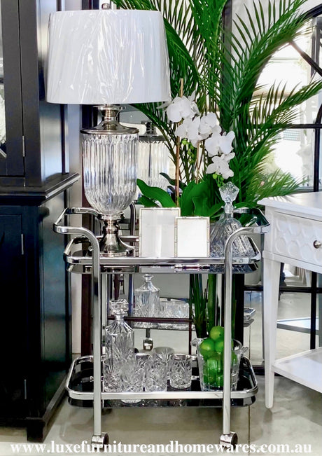 Bella Glass and Nickel Lamp with White Linen Shade and Black Trim