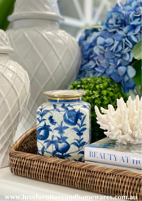 Regular price $189.00Unit price /UnavailableBlue & White Peach Pattern Square Jar With Gold Trim