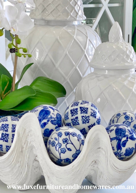Regular price $89.00Unit price /UnavailableVery low stock (2 units)Blue & White Set of Six Motif Decorator Balls