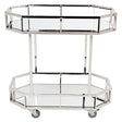 Impress your guests and add glamour to your home with this magnificent and luxurious bar cart! It features two mirrored shelves for displaying your treasures in style and large stainless steel high quality castors.