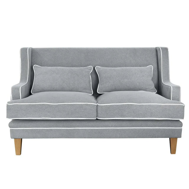 Add style to your home with the Newport two seater sofa in Grey with white piping. Featuring beautiful sculpted arms, cushioned backing, generous seat depth and mid tone timber legs.