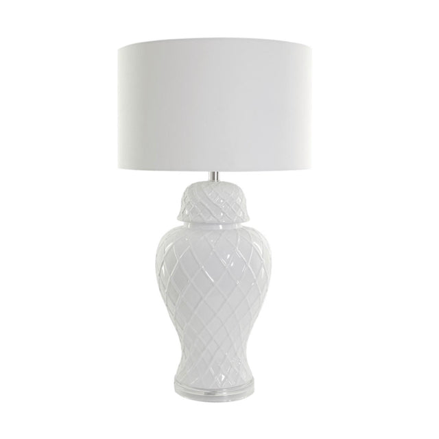 Make a striking statement in your home with this beautiful white ceramic diamond ginger jar lamp. Featuring a stunning criss-cross raised diamond design, it's ideal for all styles of décor including Hamptons, Classic, Coastal & French!
