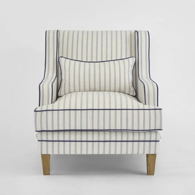 Add style to your home with the stunning Newport armchair in blue and white pinstripe. Featuring beautiful sculpted arms, cushioned backing, generous seat depth and mid tone timber legs this piece will add sophistication to your home!.