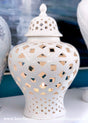 A stunning hand glazed ceramic temple jar with geometric design ideal for all styles of decor including the Hamptons. Place a candle inside or simply remove the lid and fill with florals or greenery to use as a beautiful vase. Can also be placed in pairs or as a trio of varied heights on a buffet or console to create that designer look!