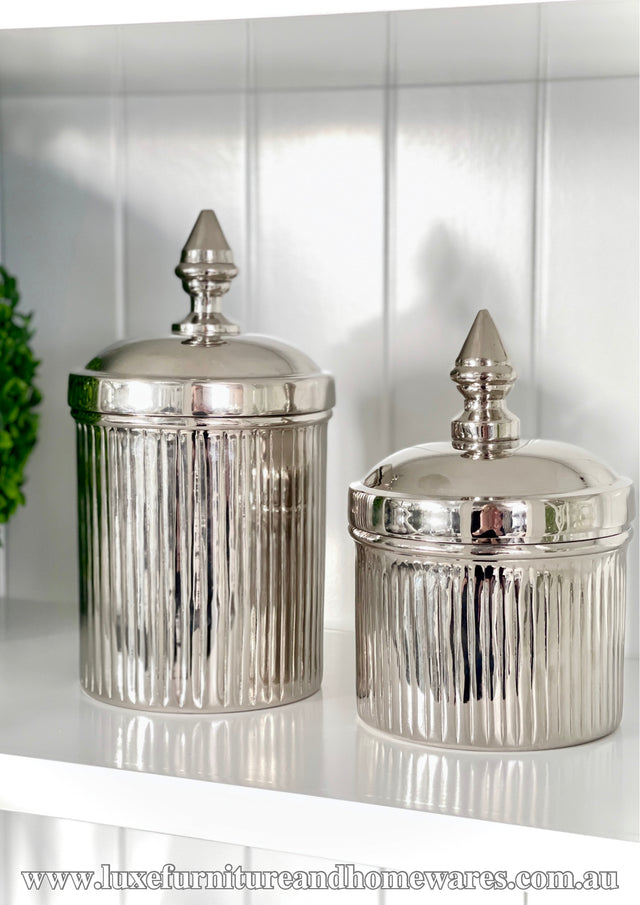 A touch of elegance to your home with this set of two silver ribbed canisters. Includes 1 x small and 1 x large canister.