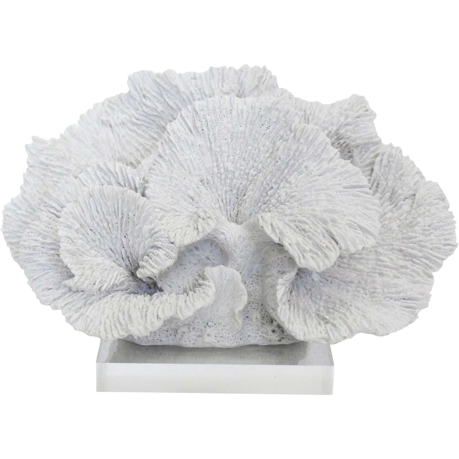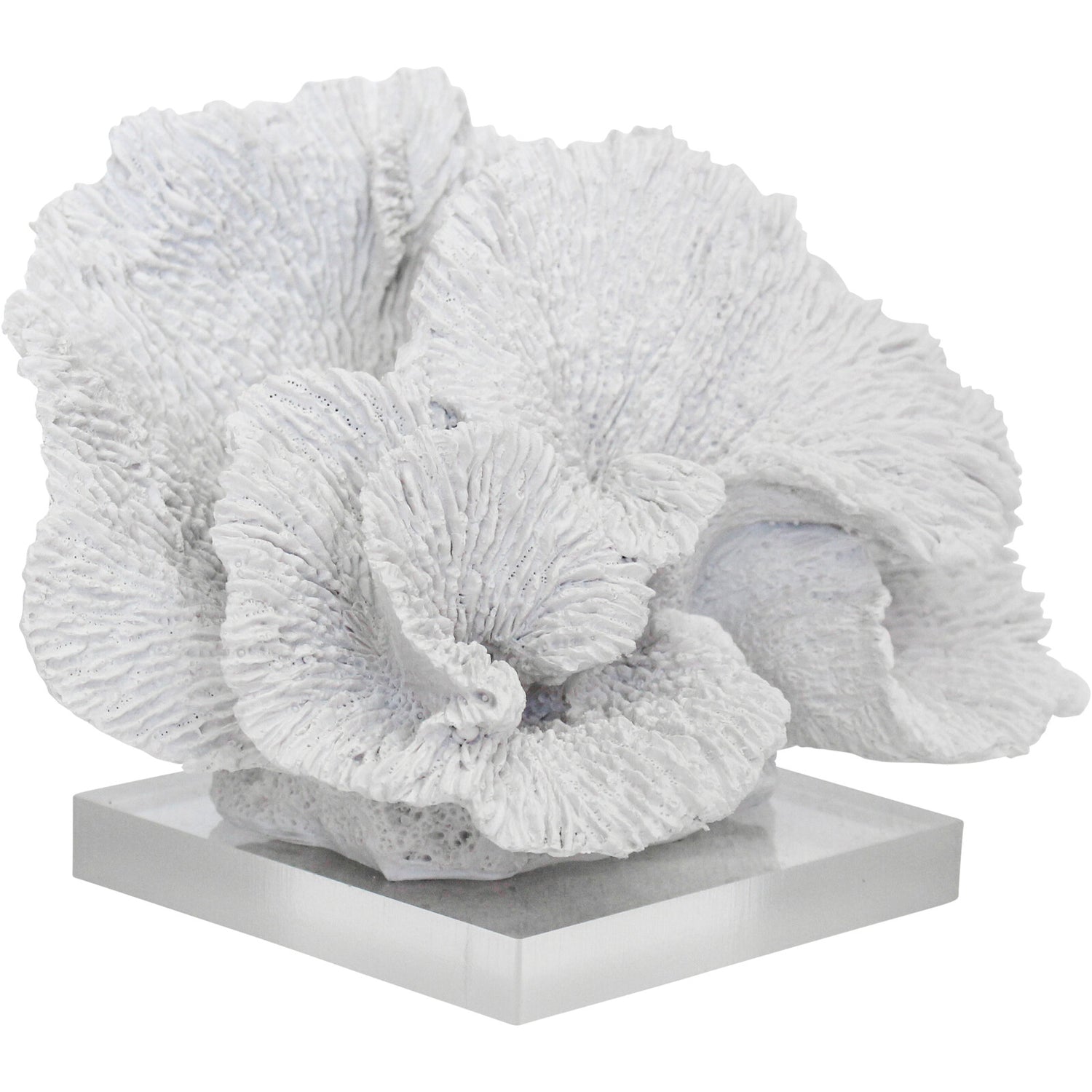 Bring the serene beauty of the ocean into your home with this striking white fan coral sculpture. Elegantly crafted from durable polyresin and set atop a sleek, clear acrylic base. Inspired by natural sea coral, it's intricate branching form and matte white finish offer a sophisticated coastal accent, without the fragility of real coral.
