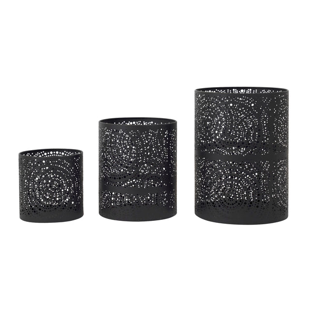 Add something special to your styling with this set of three ember black etched metal cylinder hurricanes. Each set contains one of each size, in varied heights. Add a candle inside each Hurricane (not included) to create a beautiful effect!