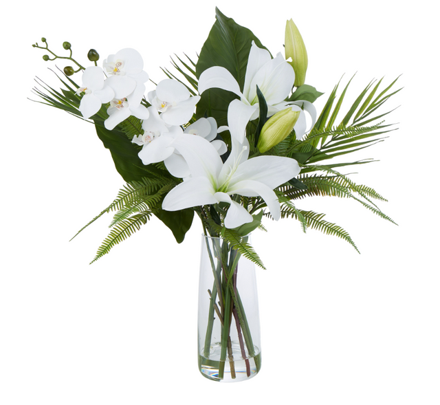 Create an elegant and visual statement in your home with this stunning lily arrangement. Featuring beautiful white flowers and luscious green leaves in a beautiful glass vase, this arrangement will make the perfect accessory to your home.