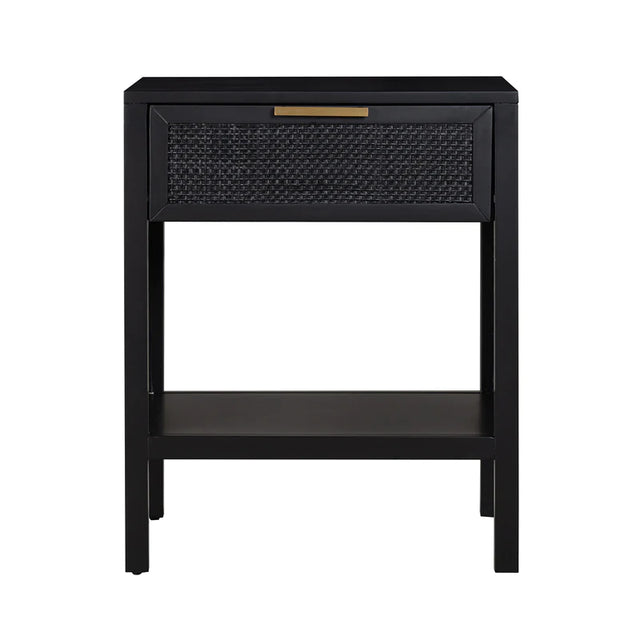 The Winslow Bedside table features a stunning rattan drawer front with brass handle. Featuring one drawer with metal runners and a base shelf for added storage.