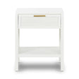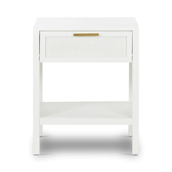 The Winslow Bedside table features a stunning rattan drawer front with brass handle. Featuring one drawer with metal runners and a base shelf for added storage.