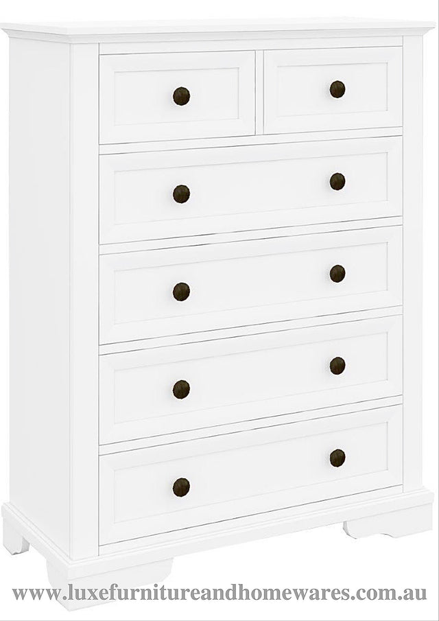 Make a statement in your home with this beautiful tall boy. Featuring six drawers with metal extension runners with black felt lining. Suited to all styles of decor including Hamptons, Coastal, Classic and French.