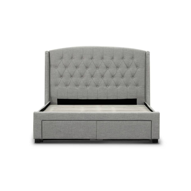 Create your dream bedroom with our beautiful Royale Queen size bed frame! Upholstered in a light grey linen look fabric with a stunning button tufted headboard and four inbuilt storage drawers. Suited to all styles of decor including Hamptons, Coastal, Classic and French.