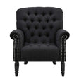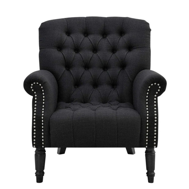 Make a statement with this stunning button tufted armchair in black linen with dark stained oak legs.
