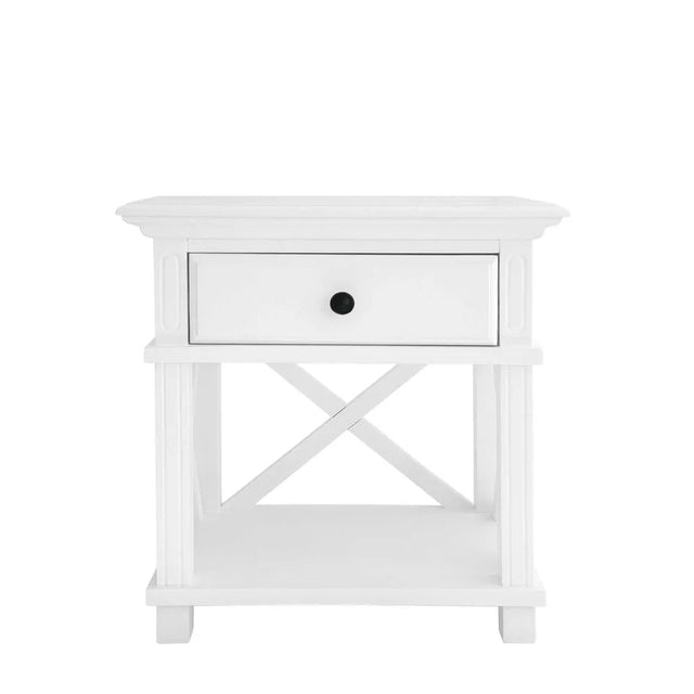 The Newport bedside table features a stunning crossed side and back design with a single drawer on metal extension gliders and a base shelf. The Newport collection is a timeless furniture range suited to all styles of decor including Hamptons, classic, coastal and French provincial.