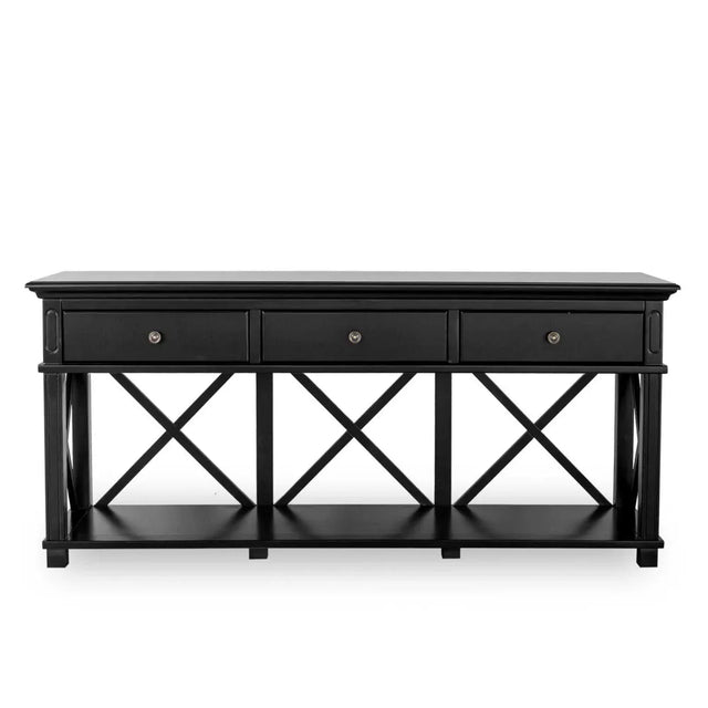 The Newport Console Table features a stunning cross back design, three drawers and a base shelf for added storage. Suited to all styles of decor including Hamptons, coastal, classic and French. The oversized appearance of this piece will make a grand statement.