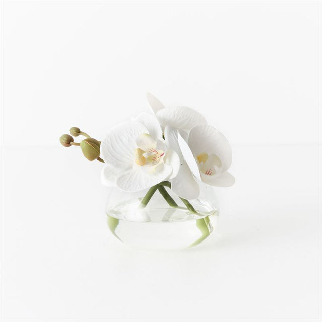 Add a beautiful touch of greenery to your home with this small white orchid set in glass vase. Ideal for placing on a mirrored tray in your bedroom, bathroom or living room!