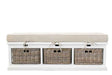 Add a stylish storage solution to your home or entry with this beautiful ottoman. Ideal for all styles of décor it features a beautiful painted white finish to the frame with a crossed design, thick padded seat with natural linen upholstery and three hand woven grey wash rattan pull out baskets. The large baskets are perfect for storing shoes, bags or toys in style!
