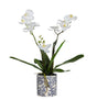 Add a beautiful touch of greenery to your home with this stunning orchid arrangement in a ceramic blue and white pot.